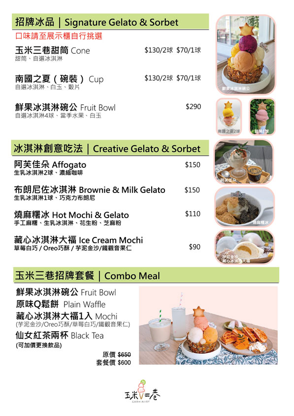 餐點提供十多種冰淇淋口味、冰淇淋水果碗公、燒麻糬冰、手作甜點與獨一無二的米鬆餅,各式飲品(咖啡、果汁、氣泡飲)。人氣招牌為冰淇淋水果碗公,將當季水果當作碗,堆疊四球冰淇淋,吃的到冰與水果,是最道地的屏東冰淇淋吃法!